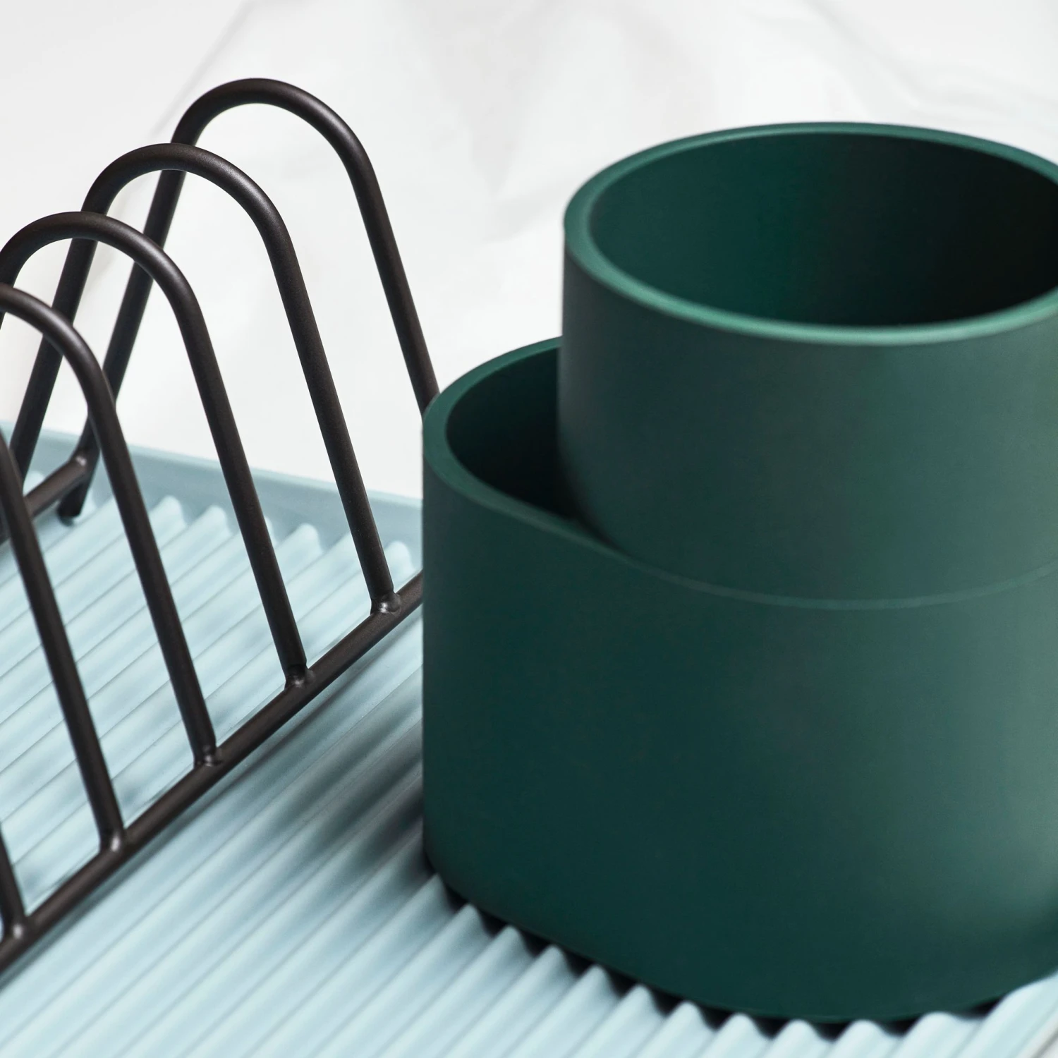 A trio of functional designs for draining the dishes, Shane Schneck’s Dish Drainer comprises a ridged melamine tray, steel plate rack and silicone cutlery holder. The contrasting shapes, materials and colours add visual interest to this everyday kitchen essential.