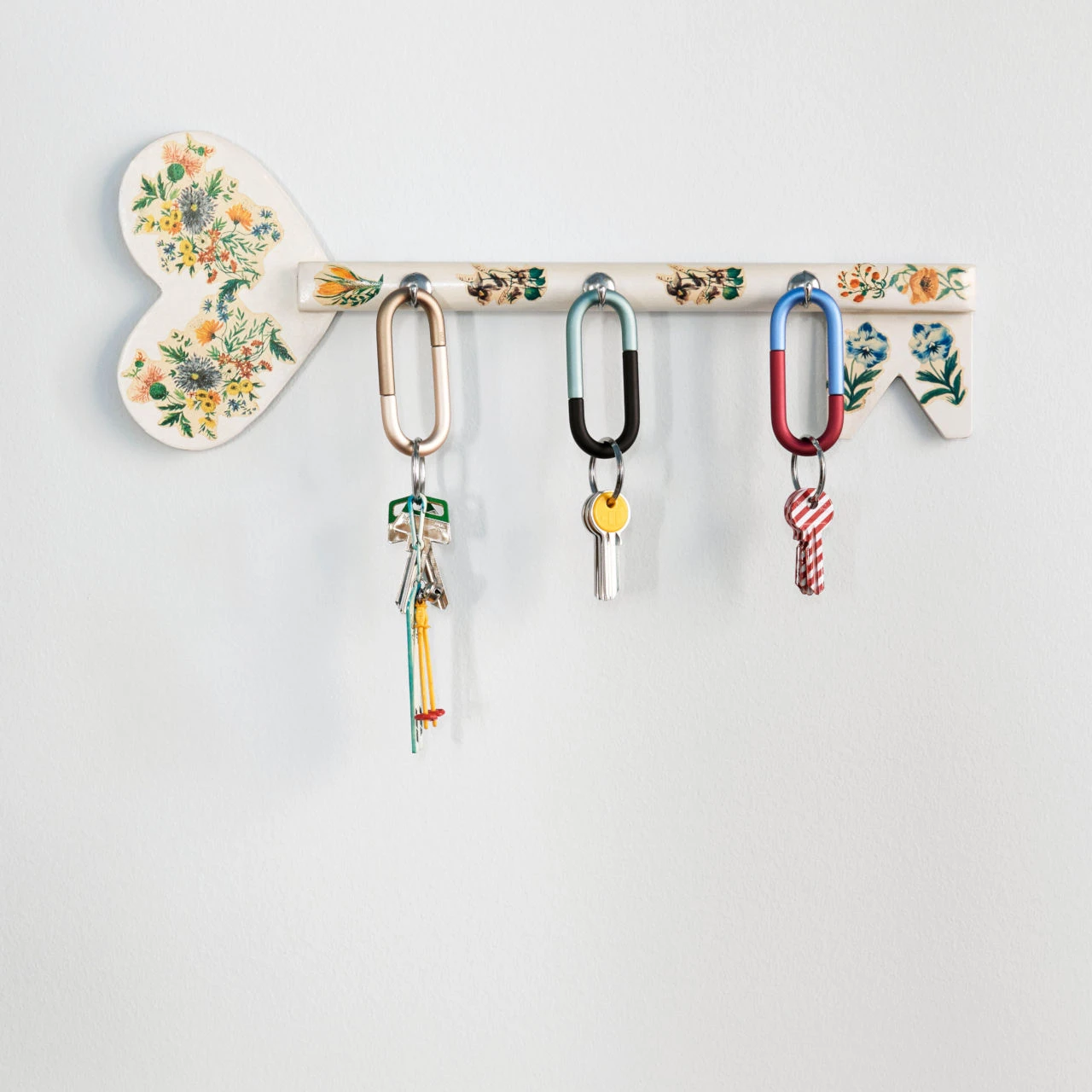 These loop form keyrings are made from aluminium by HAY and come in three different colour variations: black, olive green and red. Although the colours are listed like this each keyring is actually bi-colour.