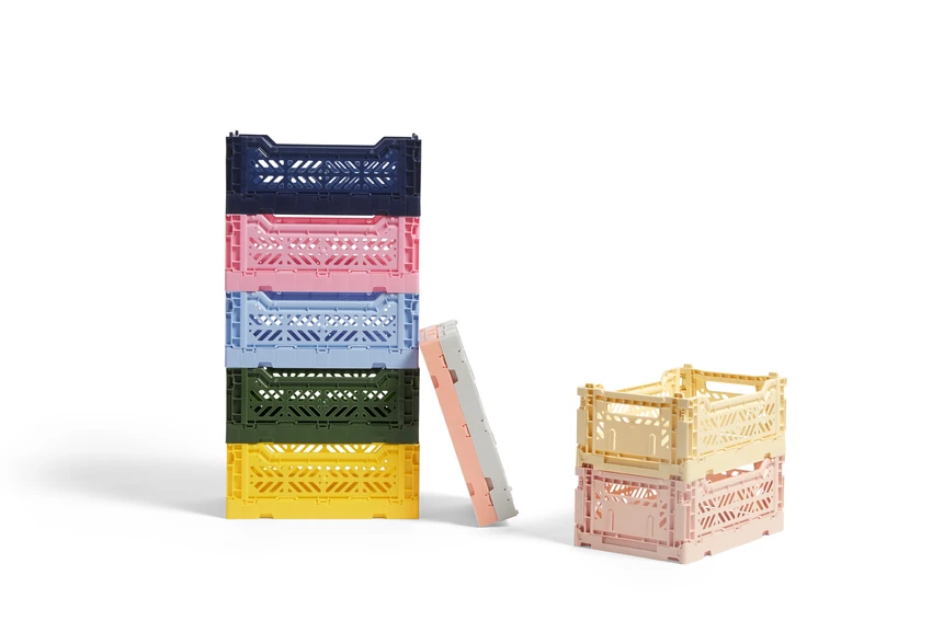 Multifunctional plastic crate with ventilated and stackable design in a variety of different colours and sizes. Flat for easy shipping and self click-assembly.