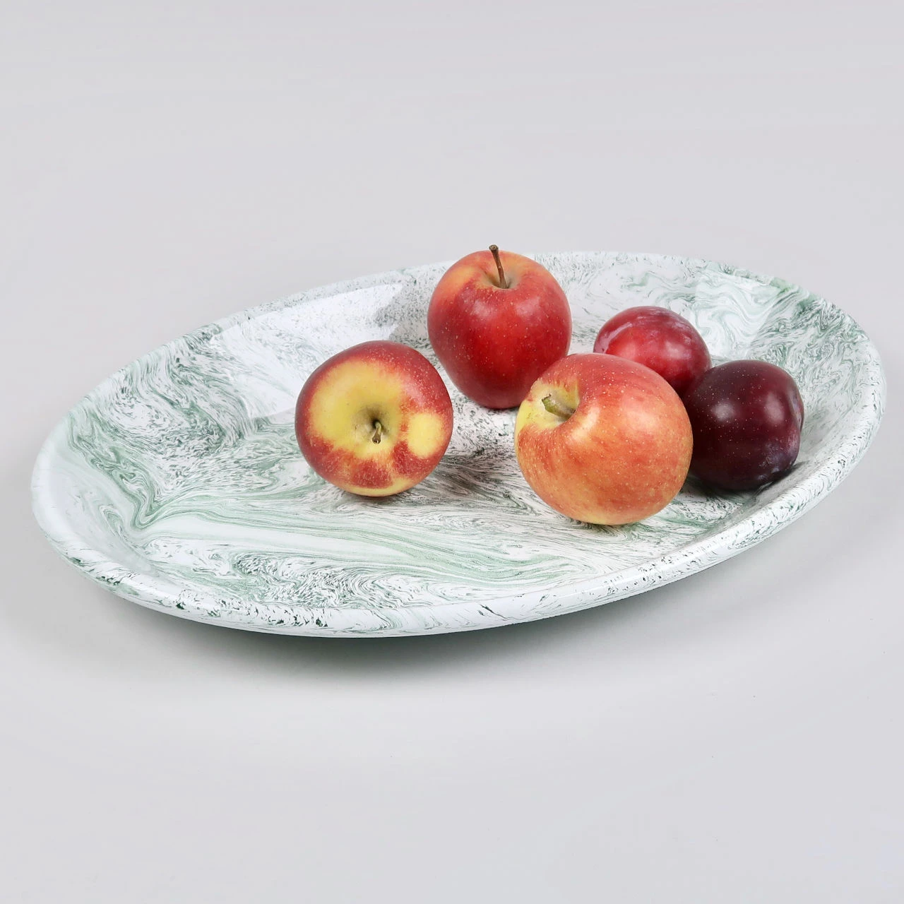 The form of this particular shape lends itself to being used for a plate of roasted vegetables, or a salad, or a pile of pastries, or as we have shown in the photograph some fruit. The colouring of the enamel suits all manner of foodstuffs.