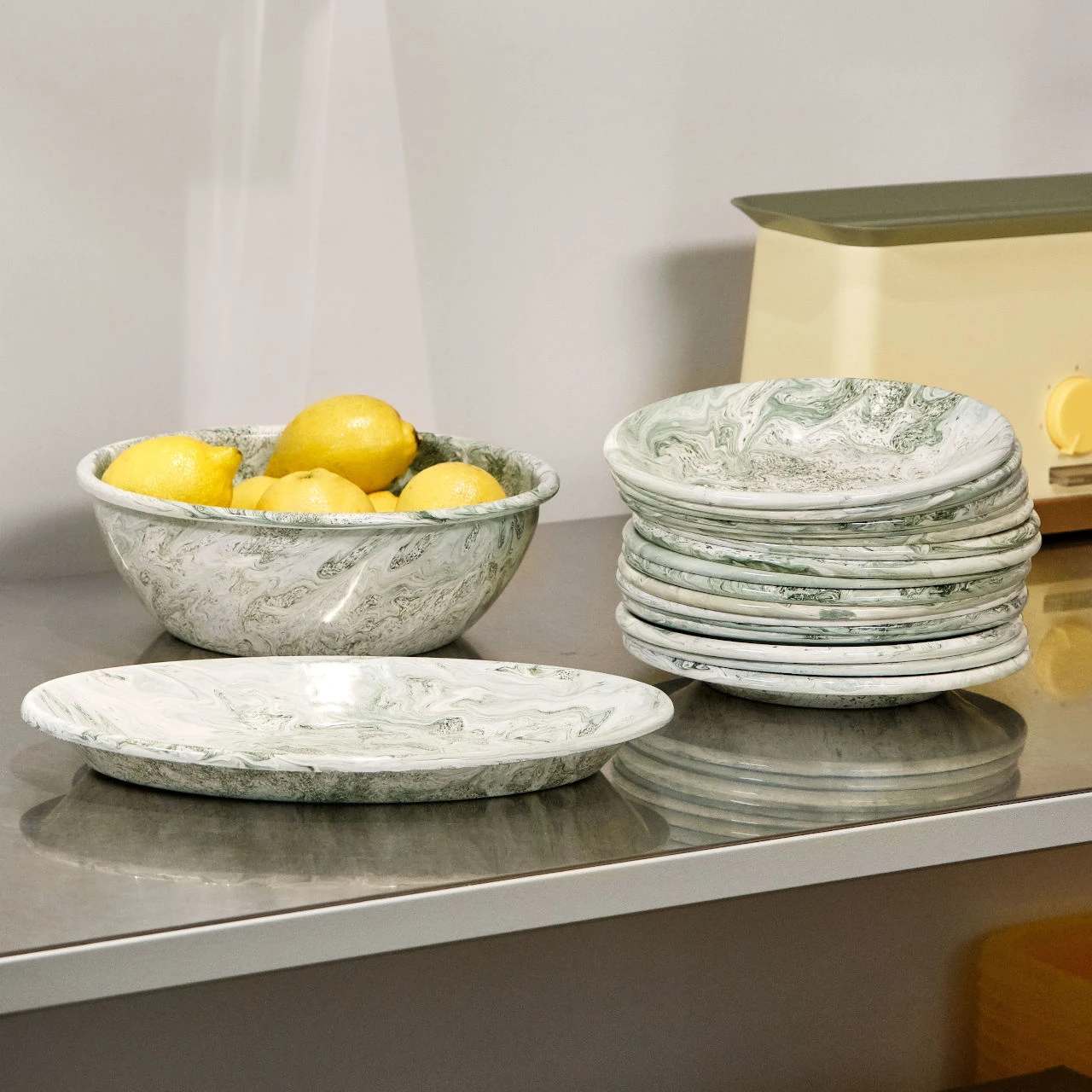 This enamel dish is from a new range by HAY. The enamelled steel has a green marbled pattern which differs across every piece that is made.