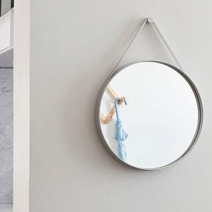 Il cinturino è dotato di una scanalatura attorno al bordo per contenere un robusto cinturino in gomma che viene utilizzato per montare lo specchio sulla parete. Con il suo design funzionale e minimalista, Strap Mirror è perfetto per essere appeso in camere da letto e corridoi