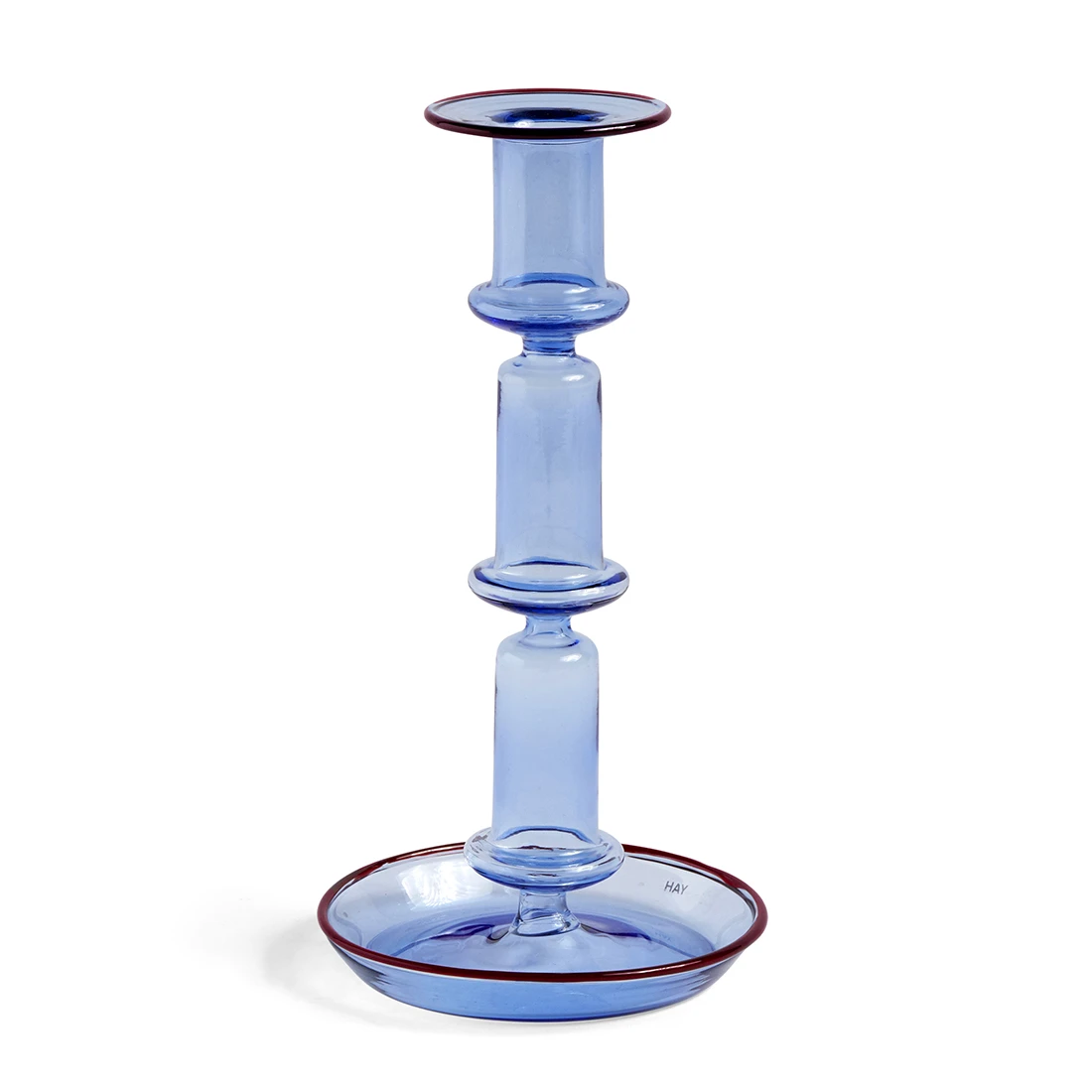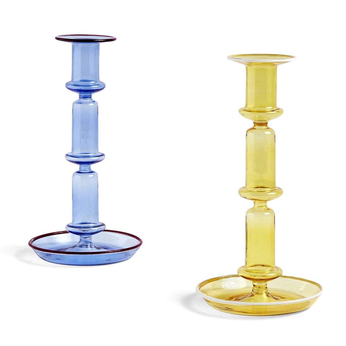The taller version of the HAY’s Flare candleholder is just as pretty and elegant as its lower version. In fact, they look great together. Borosilicate glass, blue or yellow, with the painted rim in contrasting colors giving a very modern look to a very classic design.