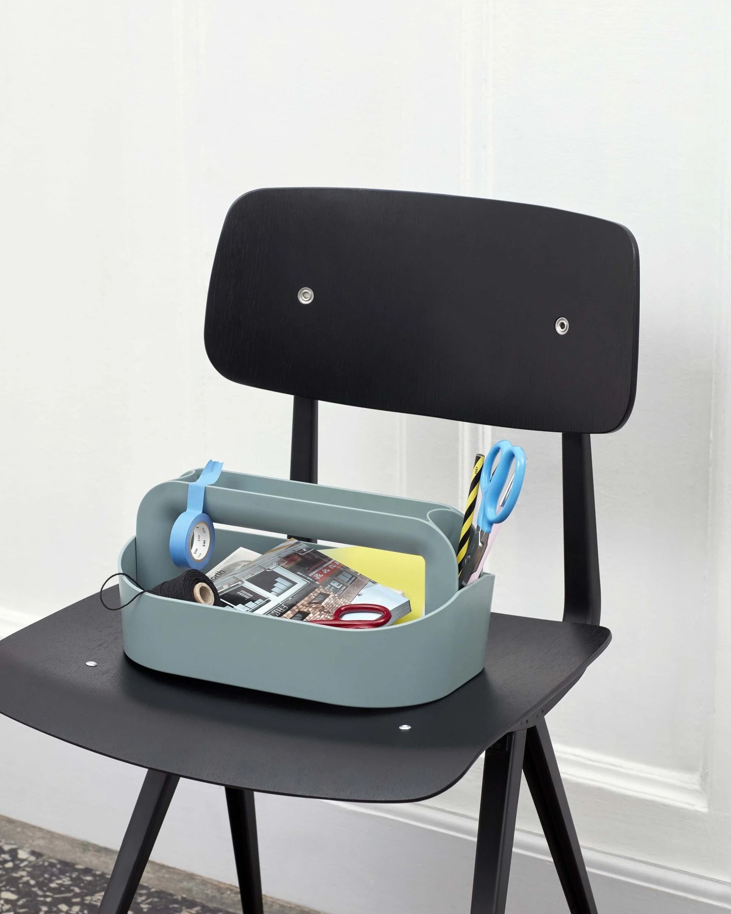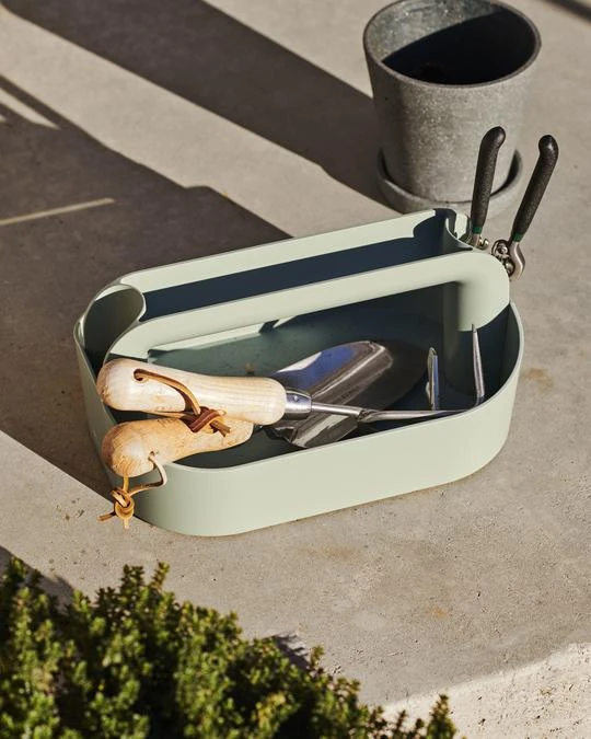 La práctica caja de herramientas de plástico está diseñada por Shane Schneck con compartimentos adicionales a los lados y en la parte superior del asa para optimizar el espacio de almacenamiento.