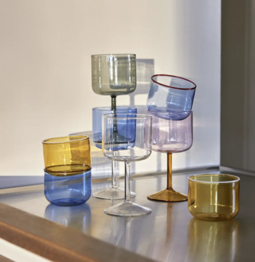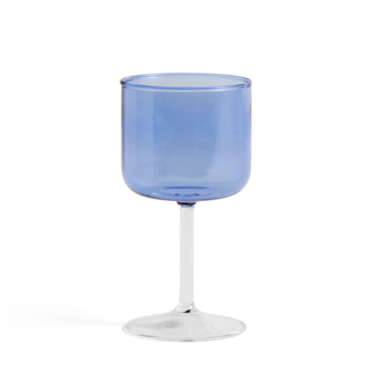 Set of 2 blue wine glasses, made of borosilicate glass, designed by HAY Comes in a nice, blue giftbox.