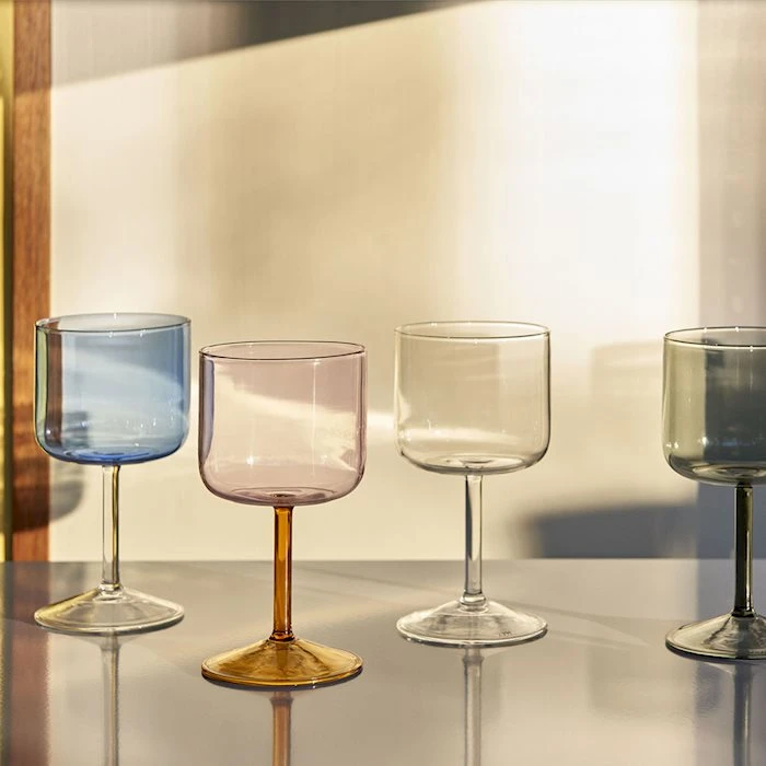 Tint Wine Glass is a collection of wine glasses made in tinted and clear borosilicate glass. The elegant, simple design is suitable for serving wine, as well as water, juice and other soft drinks. The glasses come in sets of two, available in different colours.