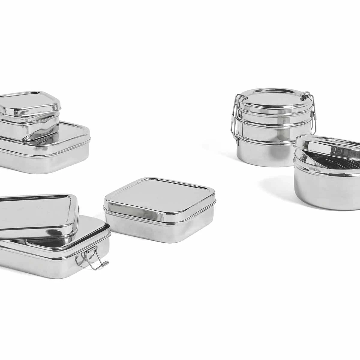 Die runden, rechteckigen und quadratischen Dosen von HAY verfügen über zusätzliche Schichten und Tabletteinsätze, die sie kompakt und praktisch für die Aufbewahrung von Lunchpaketen und anderen Lebensmitteln machen. Hergestellt aus lebensmittelechtem Edelstahl mit glänzendem Silberfinish, stehen vier verschiedene Designs zur Auswahl. Größe: Ø 13 x Höhe 11 cm Material: Edelstahl Praktische dreiteilige Lunchbox von HAY aus Edelstahl.