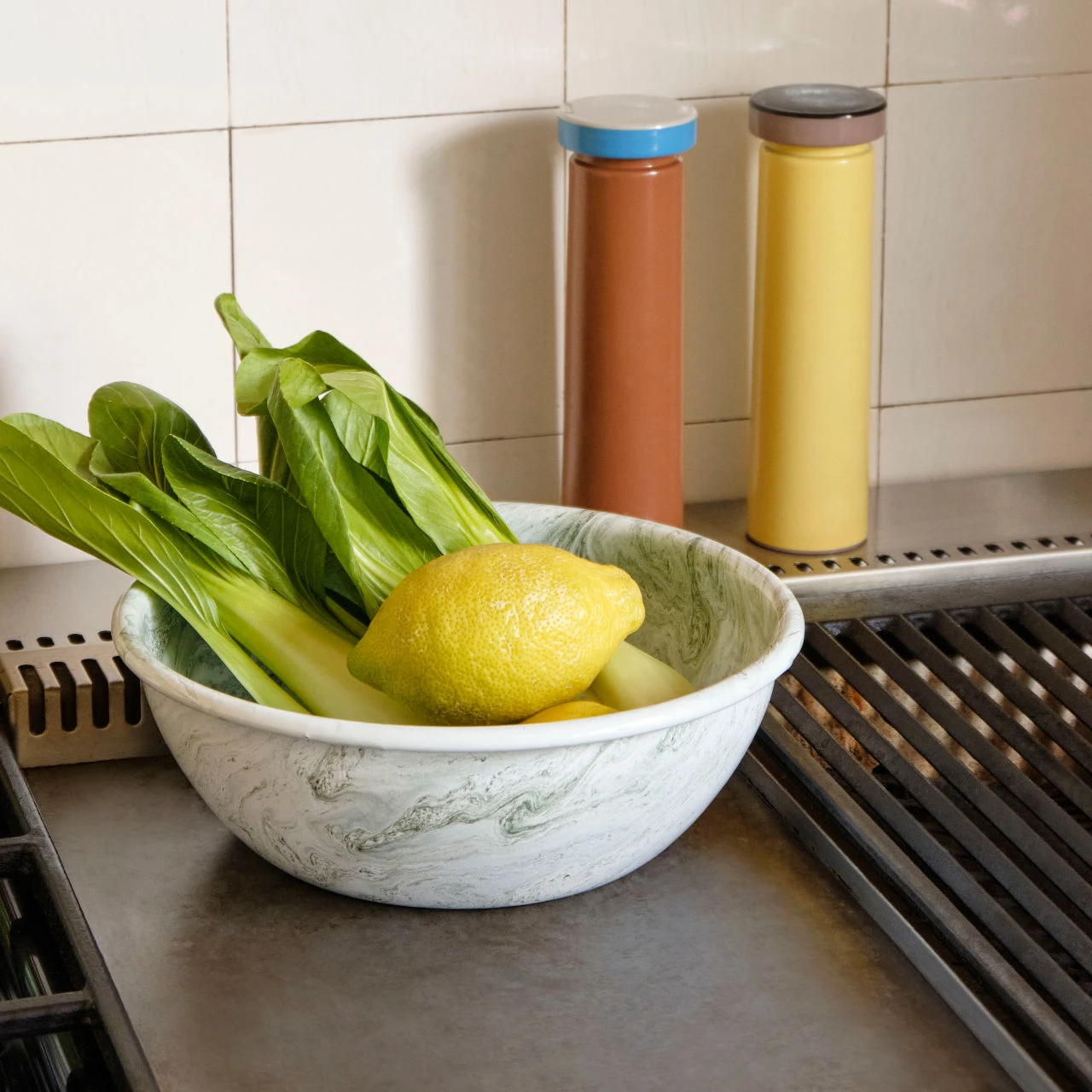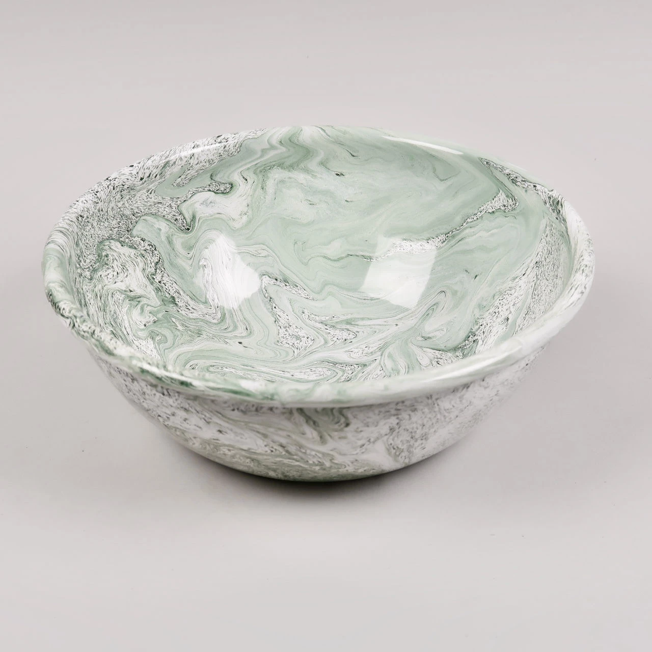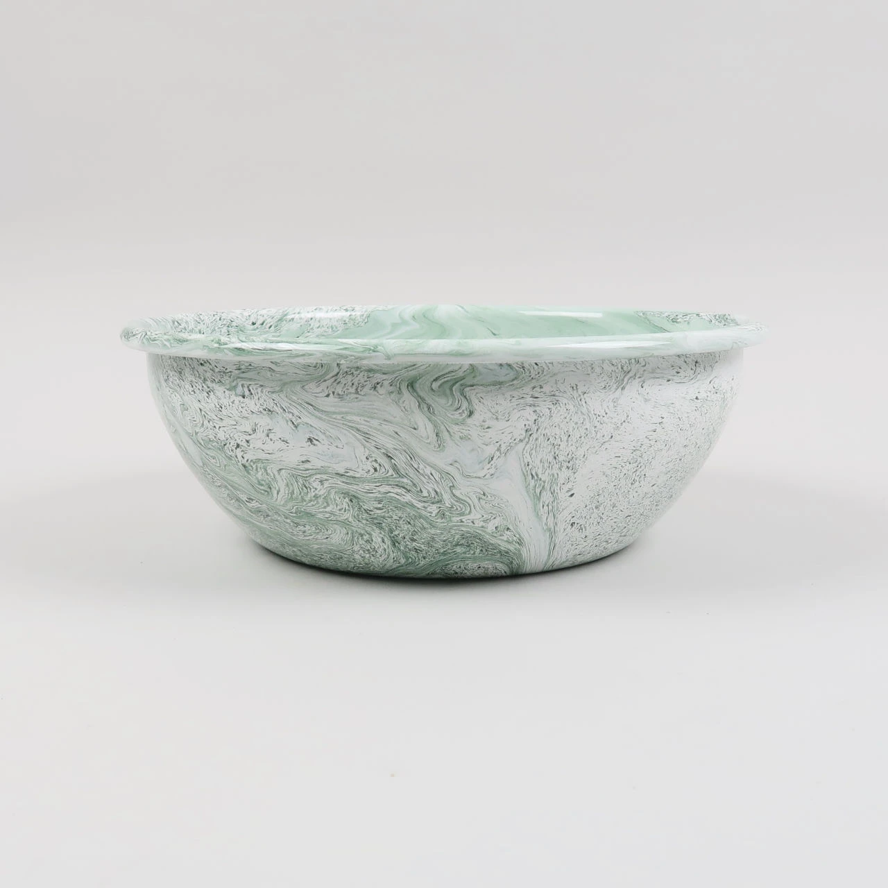 Soft ice salad bowl. This enamel dish is from a new range by hay. The enamelled steel has a green marbled pattern which differs across every piece that is made. The form of this bowl lends itself to being used for a huge variety of foodstuffs. I am envisioning that I might use it for a salad of radicchio, gorgonzola and walnuts to contrast with the pale green marbling or for a simple fresh green salad to complement the pattern. The dish is made in Turkey. We also have a shallow oval bowl with the same finish.