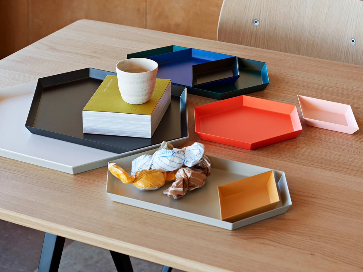 With an array of different colours and geometric shapes, you can build designs and colour configurations to suit you, and select its function. Use for serving coffee and drinks, collecting small things such as jewellery, receipts, keys and coins. The concept of the design urges you to play – and many find it difficult to stop moving them around in search of the next combination.