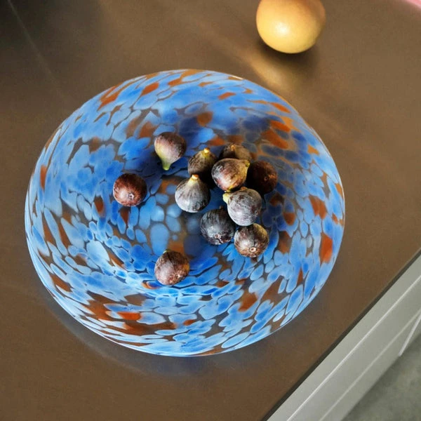 Hecho a mano con una técnica especial de soplado de vidrio que involucra múltiples capas de puntos de vidrio de colores, el plato Splash presenta un patrón único en forma de remolino. Disponible en dos colores diferentes, la fuente se puede utilizar como centro de mesa decorativo o como fuente para frutas y otros alimentos. Ø32 x 3 cm Cristal