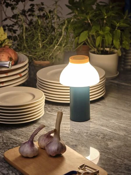 La lampe Pc Portable couleur vert océan, créer par le designer français Pierre Charpin pour la marque Hay ♥ Pierre Charpin s’est inspiré de forme organique avec une volonté de créer une lampe qui s’intègre dans tous les environnements. Le design rappelle celui d’un champignon, ce qui donne au luminaire une touche naturelle et aimante. Sa structure en plastique durable avec une finition mat, s’élance depuis son socle élancé et arrondi et se termine par un chapeau sous forme de champignon où vient se loger le diffuseur en polycarbonate. Cette lampe PC portable est disponible dans d’autres coloris. L’avis de l’Atelier Kumo: une lampe portatif que l’on adore pour vos intérieurs et extérieurs ! Couleur : vert océan, blanc et jaune Câble : fourni Matériaux : corps : ABS, diffuseur interne (sous abat-jour) : polypropylène translucide , câble USB : plastique Dimension : hauteur : 22 cm, longueur : 14 cm, profondeur : 14 cm Source de Lumière : LED intégré Dimmable : oui Poids : 0,300 g Autonomie : 10 heures La source de lumière est une LED intégrée, rechargeable, lorsque qu’elle est chargée elle fournit 10 heures de lumière. Elle est également munie d’un variateur de lumineux permettant d’ajuster le flux lumineux, afin créer l’ambiance lumineuse appropriée à chaque ambiance. Cette lampe portable peut être installée en intérieur comme en extérieur, elle est résistante à l’eau et aux rayures. Elle offre la liberté et la flexibilité pour être utilisée partout où elle est nécessaire. Pour un éclairage d’appoint à la maison, un éclairage de table lors d’un repas à l’extérieur entre amis. Mais également dans les cafés, restaurants et autres lieux publics.