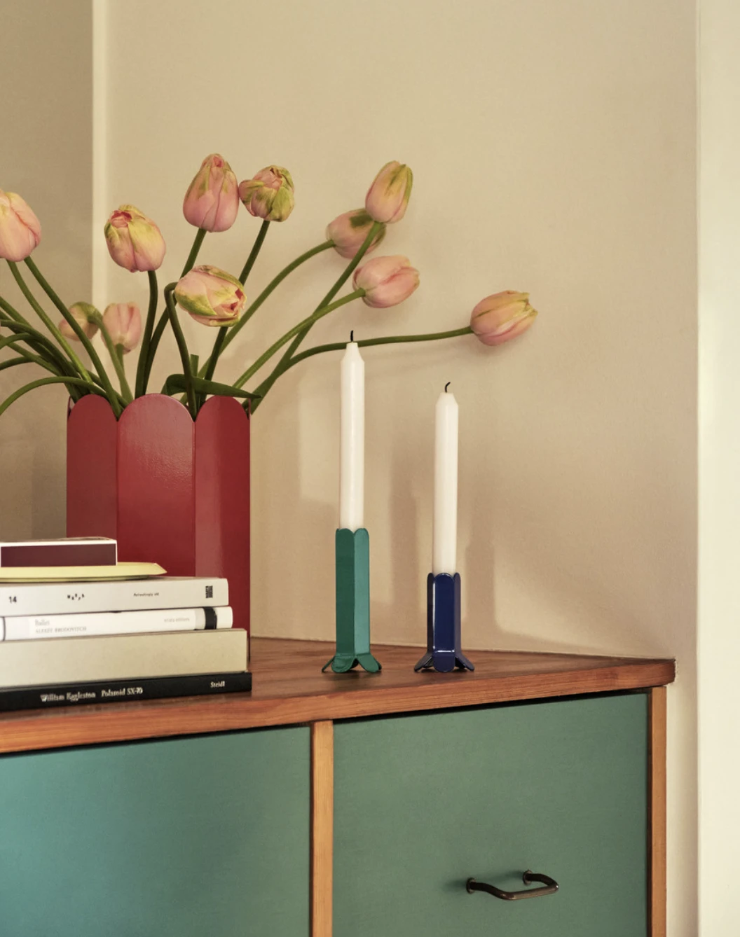 Made in aluminium and steel, Arcs Candleholder is available in two heights with different colour options.