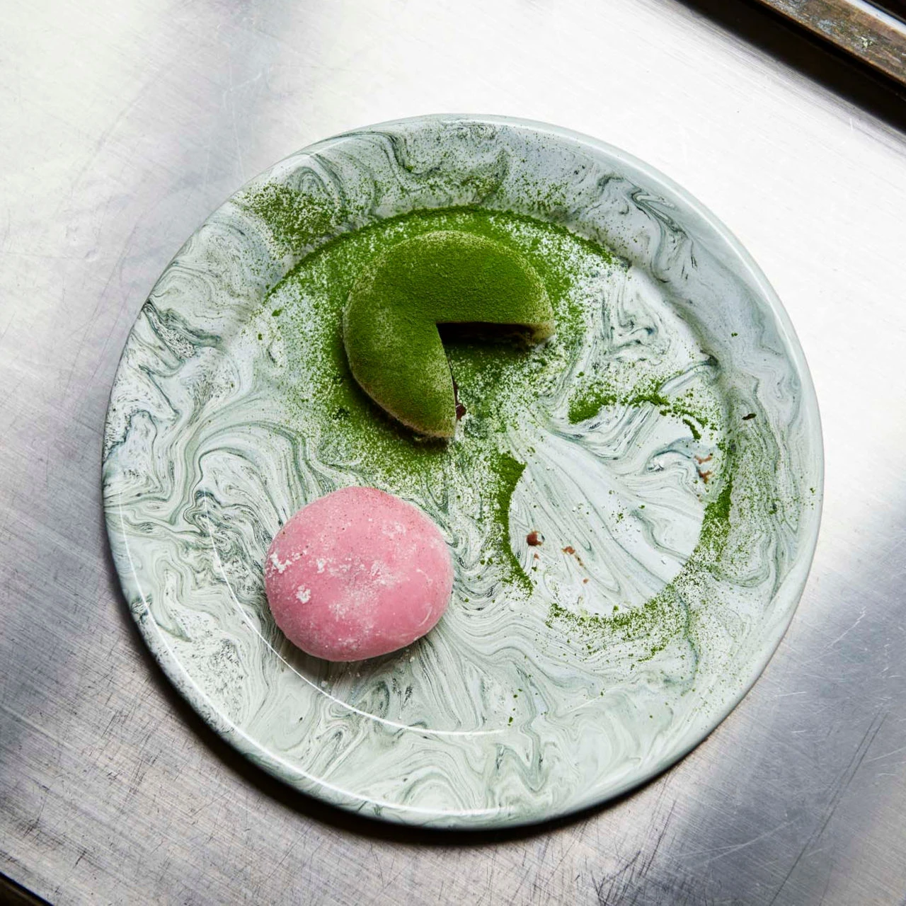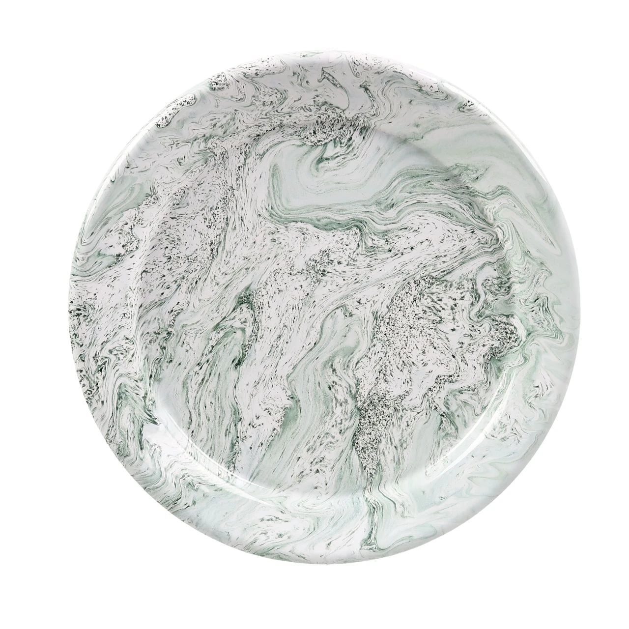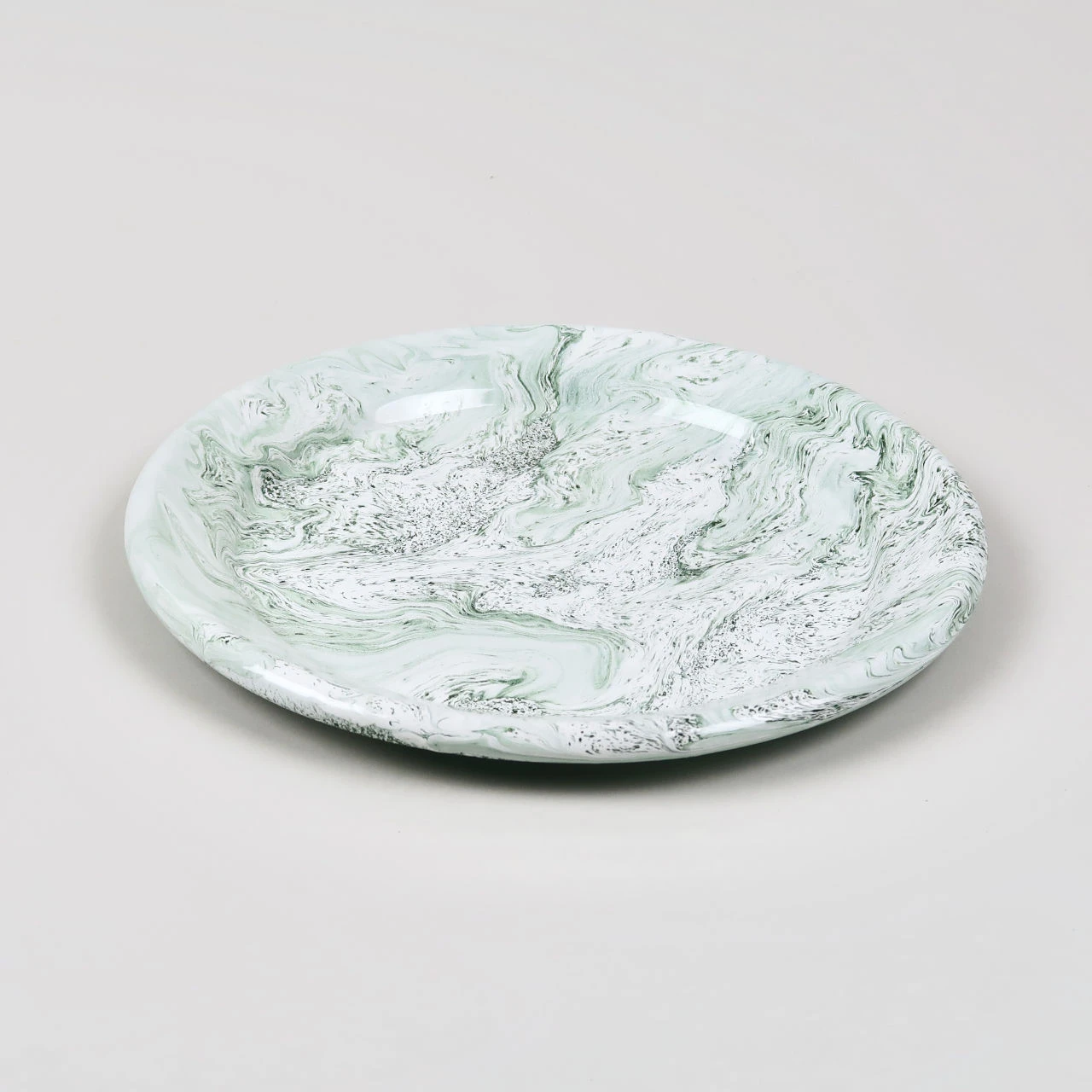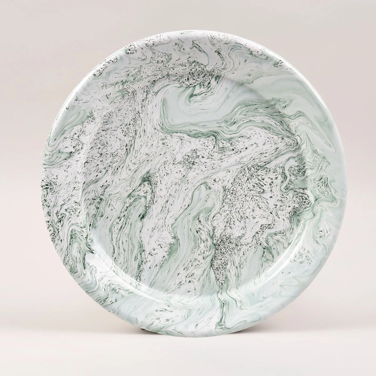 The plate is made from enamelled steel and has a marbled green and white pattern to the enamel. As the marbled enamel is all applied randomly no two plates are going to look exactly the same. All enamel is slightly more fragile than it looks and if dropped or knocked excessively the enamel may well chip. The plate will remain intact but the enamel will flake where the impact has occurred.