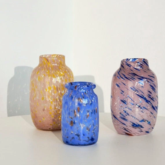 Hecho a mano utilizando una técnica especial de soplado de vidrio que involucra múltiples capas de puntos de vidrio coloreados, el Splash Vase presenta un patrón remolino único. Disponible en diferentes diseños y tamaños, los jarrones se pueden usar tanto para exhibir flores como como objetos decorativos. Ø14.5 X 22.5 cm Cristal