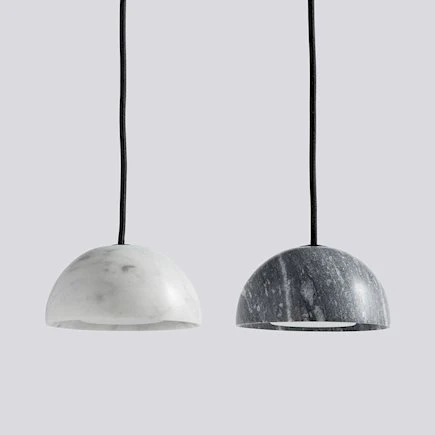 Marble Pendant is a pendant lamp made from marble to create a simple hemispherical shape. The hemisphere has a recessed removable flat LED light source that produces both downward light and a diffused side light that allows the edge of the marble to be illuminated. The light fitting is dimmable, long lasting and easy to change. Marble Pendant is available in white and black.