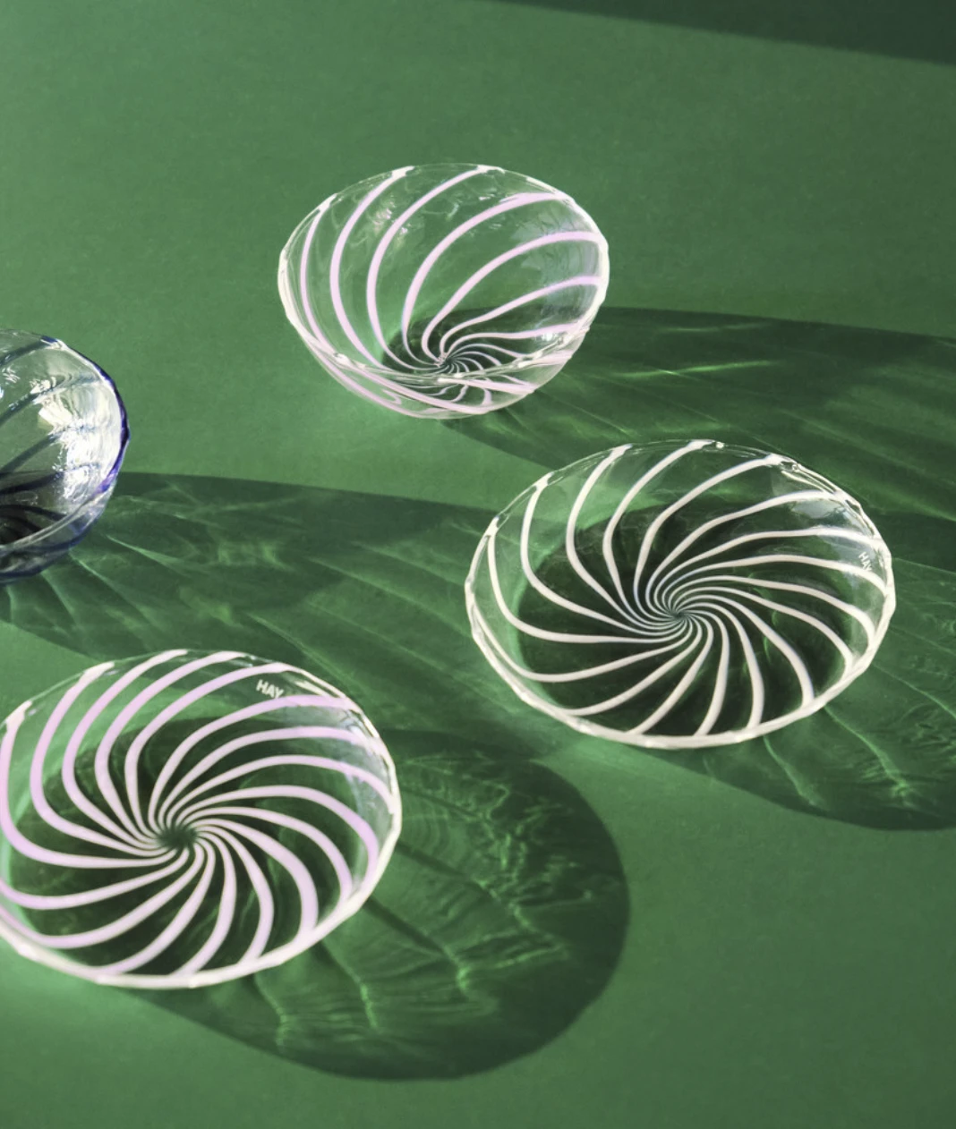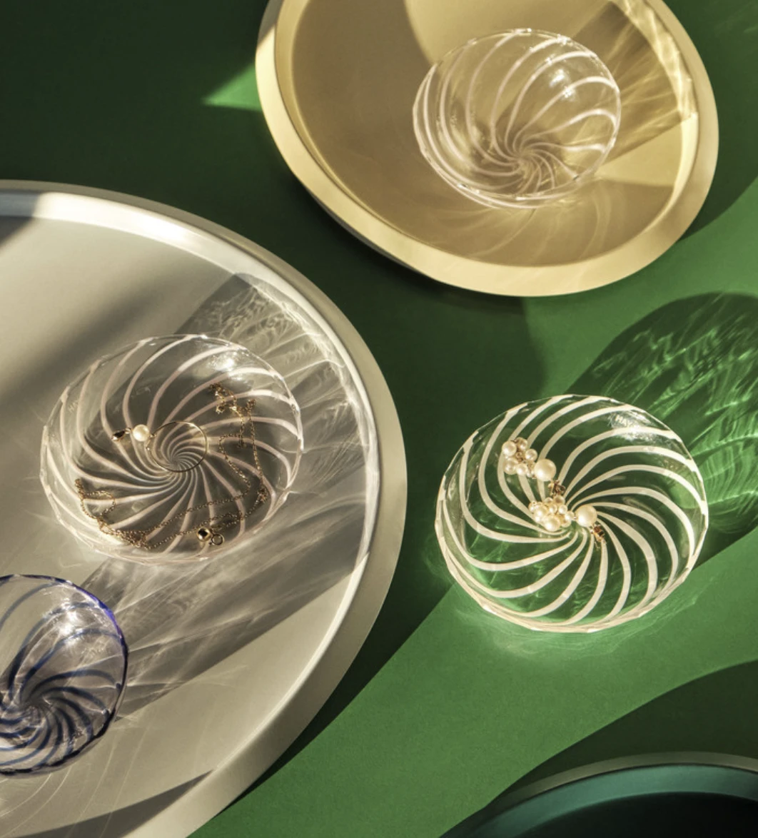 Coloured borosilicate glass with a swirling pattern creates an elegant and distinct design in HAY’s Spin. Ideal for serving food, storing small objects or just for decorative purposes.